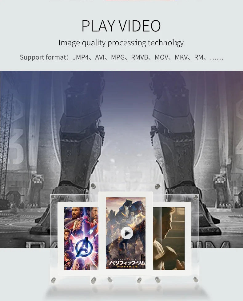 Our screen built in speaker, with internal 4GB memory for client to put their videos. So your video no more than 800MB will be ok to upload. And it will play in loop about 2-3hours after full charged.